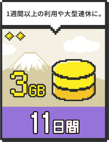 1週間を超える旅行や帰省、連休中のお出かけに。地図アプリや調べもの、SNSの閲覧など、日常的なスマホ利用を安心して行える容量と期間のプランです。